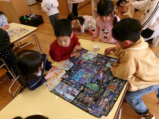 年下の子は、年上の友達にルールや技の仕方を教えてもらい、繰り返し遊ぶ様子が見られます。「3が出たから、3つ進むんだよ」「もう1回、こまの勝負しよう!」とやり取りをする中で、だんだんと友達関係が広がり、思いやりや譲り合いの心が育っています。