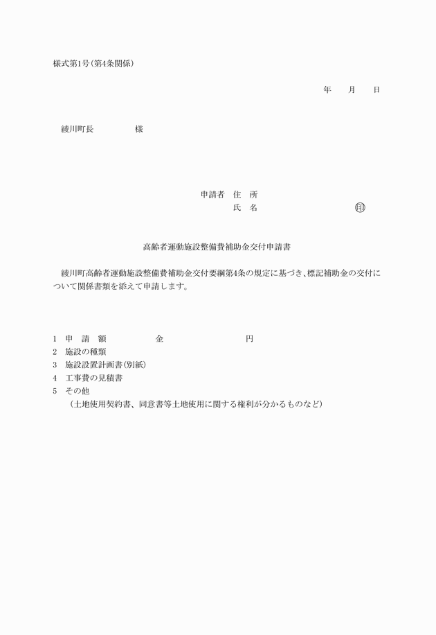 第4条 この補助金の交付を受けようとする者は、高齢者運動施設整備費補助金交付申請書(様式第1号)を町長に提出しなければならない。