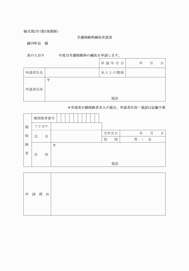 第9条 法第50条又は第60条の規定による利用者の負担額の特例の認定を受けようとする者は、介護保険利用者負担額減額・免除申請書(様式第7号)にその理由を証明する書類を添えて、町長に提出しなければならない。