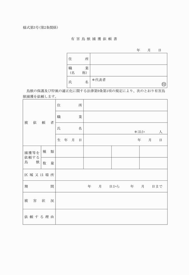 (2) 有害鳥獣捕獲についての依頼を受けて許可を受けようとする者は、当該依頼者から提出された有害鳥獣捕獲依頼書(様式第3号)