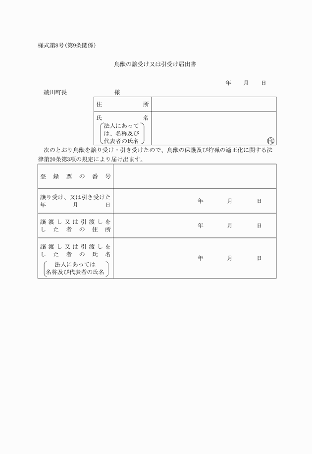 (3) 法第20条第3項の規定による鳥獣の譲受け又は引受け届出書 様式第8号