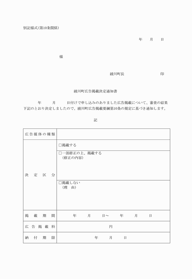 第9条 広告主は、広告媒体ごとに定める募集要項に規定する申込書に、必要な書類を添えて、町長に提出しなければならない。