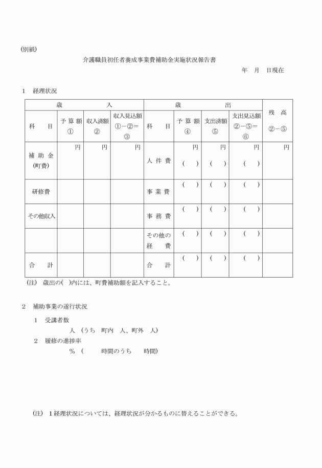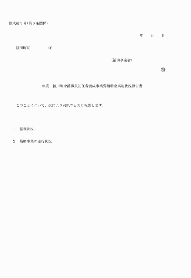 第6条 補助事業者は、補助事業の実施状況に関し介護職員初任者養成事業費補助金実施状況報告書(様式第3号)を養成事業の前半が経過した後、速やかに町長に提出しなければならない。