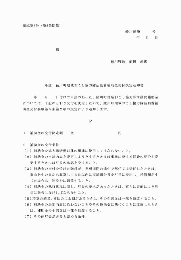 第5条 町長は、前条の規定による補助金交付申請書を受理したときは、その内容を審査し、補助金の交付の可否を決定するものとする。