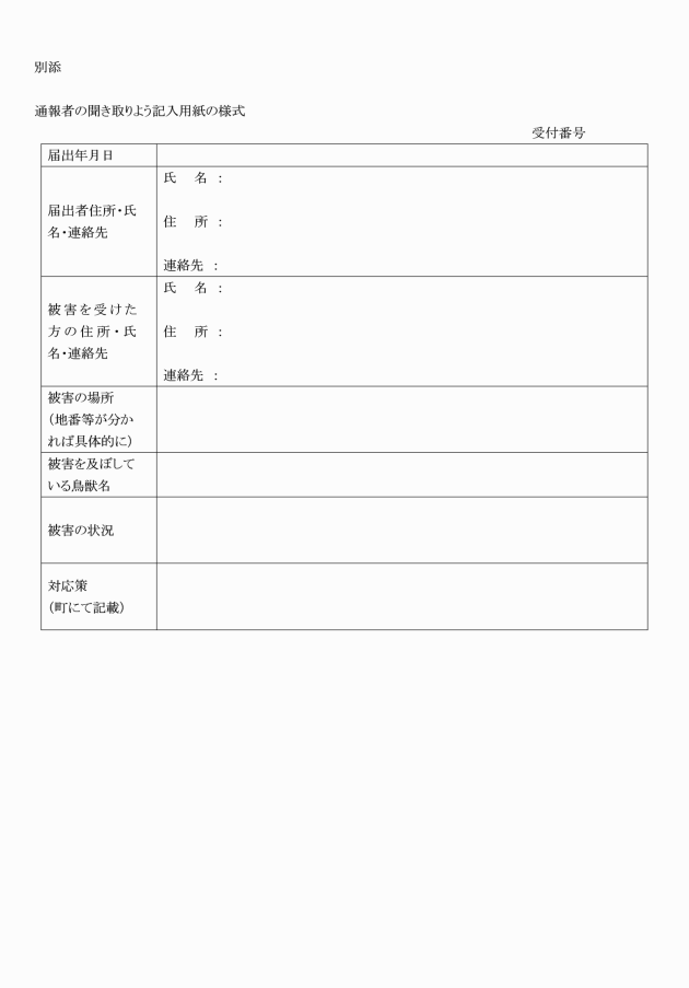 町職員は、町民から有害鳥獣の被害及び目撃・出没等の通報があった場合、通報者の住所・氏名・連絡先・獣種・場所・現場状況等を詳しく聞き取り、別添の記入用紙に記録し、確認対応者に連絡を取り出動を要請する。