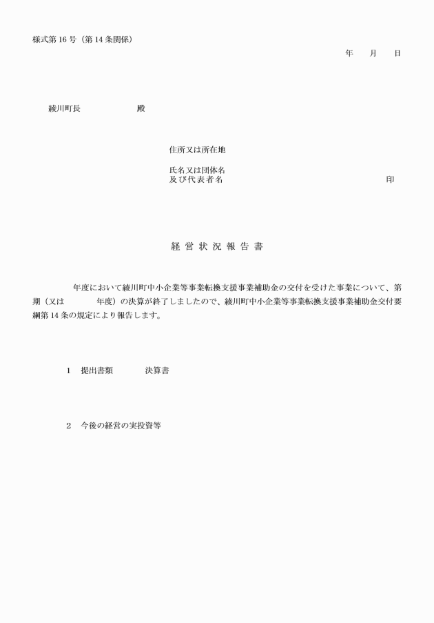 第14条 補助事業者は、補助事業の完了後5年間、各年度終了後速やかに当該年度の決算書若しくは確定申告書の写しを添付して、経営状況報告書(様式第16号)を町長に提出しなければならない。