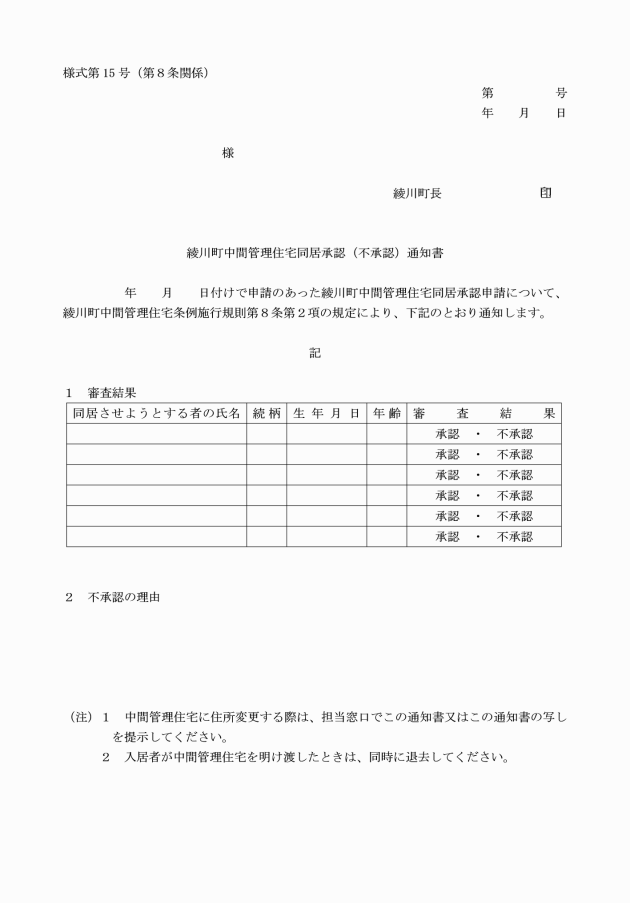 6 条例第9条第5項ただし書の規定により、町長の承認を受けようとする者は、綾川町中間管理住宅入居日延長承認申請書(様式第9号)を提出しなければならない。